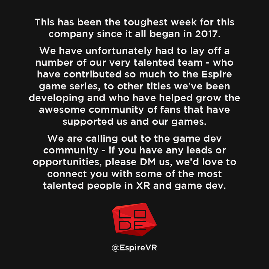 5月3日,VR潜行游戏《Espire 2》开发公司Lode在推特官方上发布了裁员的最新通知。据了解,LodeVR 是一家位于墨尔本的沉浸式媒体视频游戏公司,之前已经推出了两款非常成功的隐形射击游戏,几年前的“Espire 1”和 2022 年 11 月的续集“Espire 2”,此前该公司的开发团队共25人,现在其表示将在未来 18 个月内承担三个新的并发 VR/MR 游戏项目,其宗旨是创造“令人难忘的身临其境的玩家体验”。