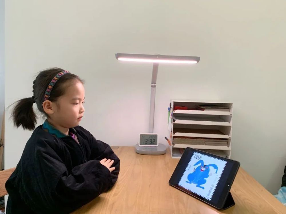 金山朱泾二小一年级谢般若同学居家欣赏蓝兔子生肖邮票