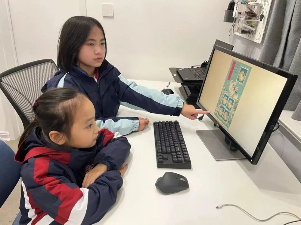 新民晚报小读者、预初年级的姐姐方文轩(属兔),给一年级的妹妹方文辕介绍法国兔年生肖邮票