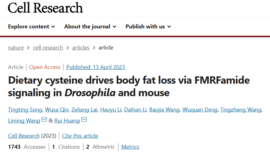 近日,浙江大学的王立铭和重庆大学的黄锐合作在《Cell Research》发表题为“Dietary cysteine drives body fat loss via FMRFamide signaling in Drosophila and mouse”的文章,研究发现膳食半胱氨酸的摄入可以促进能量消耗,抑制食物摄入,减少果蝇和小鼠的脂肪含量。