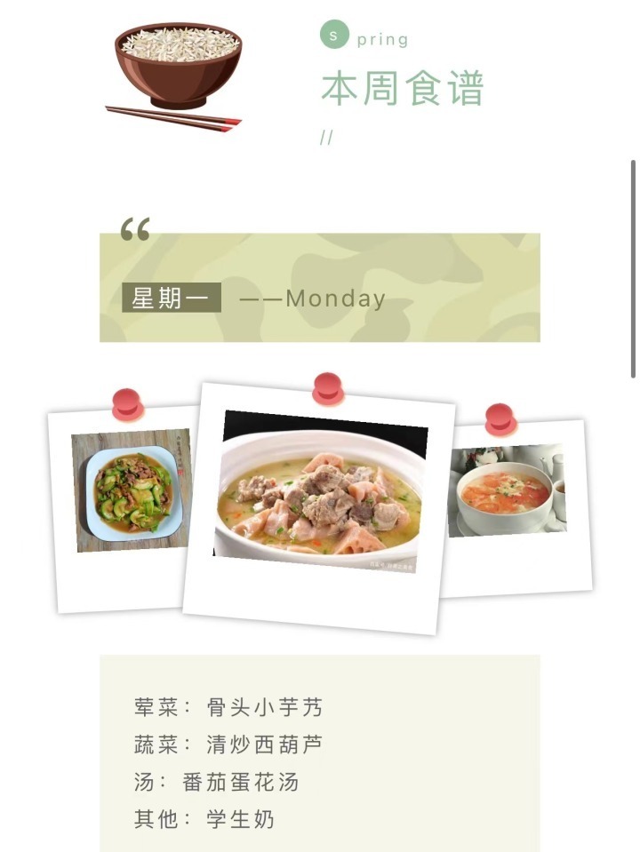 学校每日食材搭配,会把控高脂肪、高热量菜品的用量。随机翻看东苑小学的菜单,4月的一个周一,荤菜是骨头小芋艿,蔬菜是清炒西葫芦,配一份番茄蛋花汤和学生奶;周五的荤菜是干菜虾,蔬菜是油泡大白菜,配一份冬瓜虾皮汤和酸奶……从菜单来看,学校多选用蛋白质丰富的肉、虾,并搭配不同种类的蔬菜,荤素搭配较为合理。