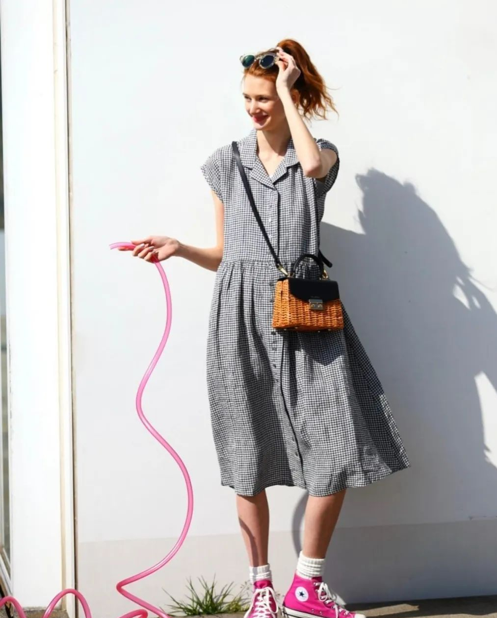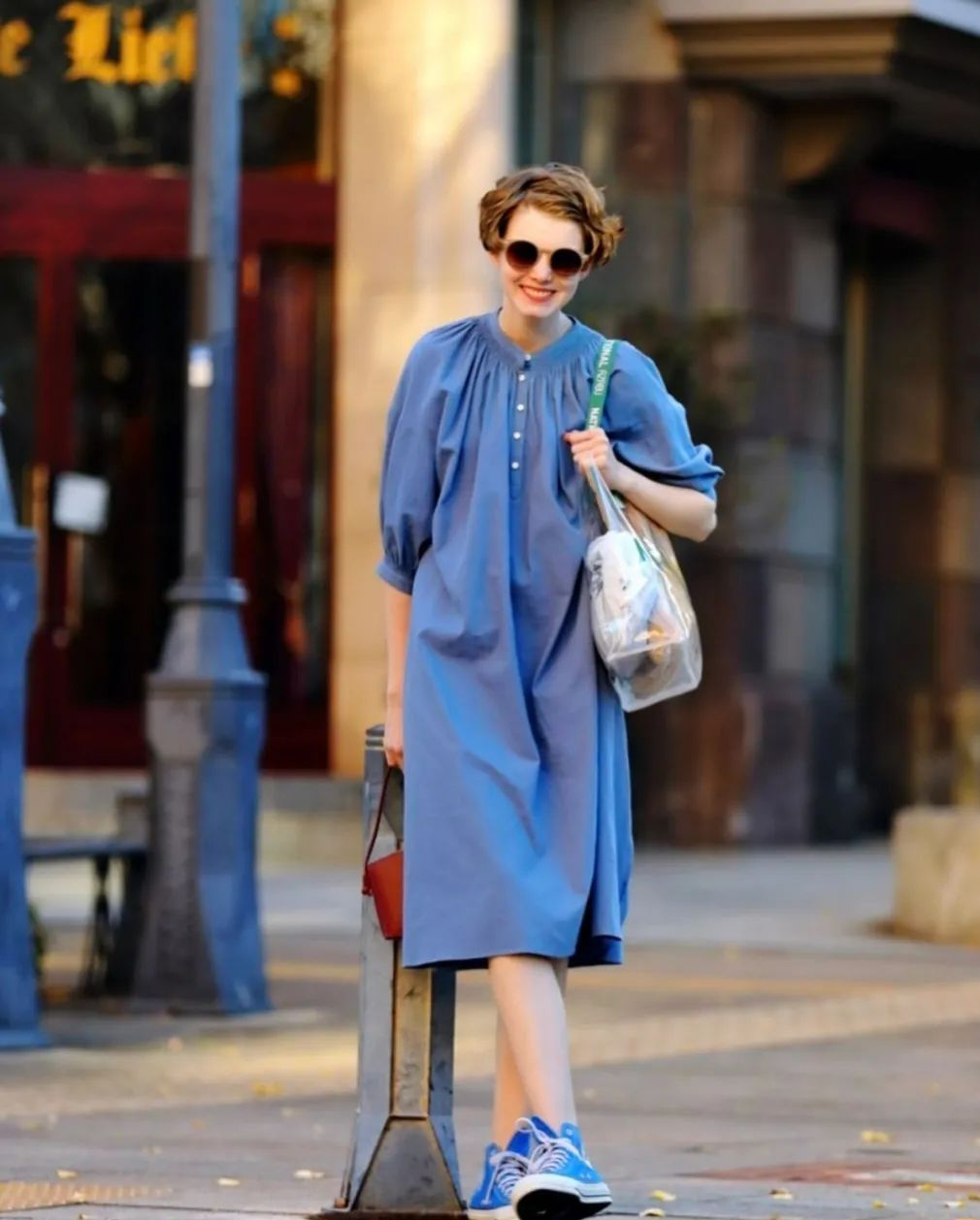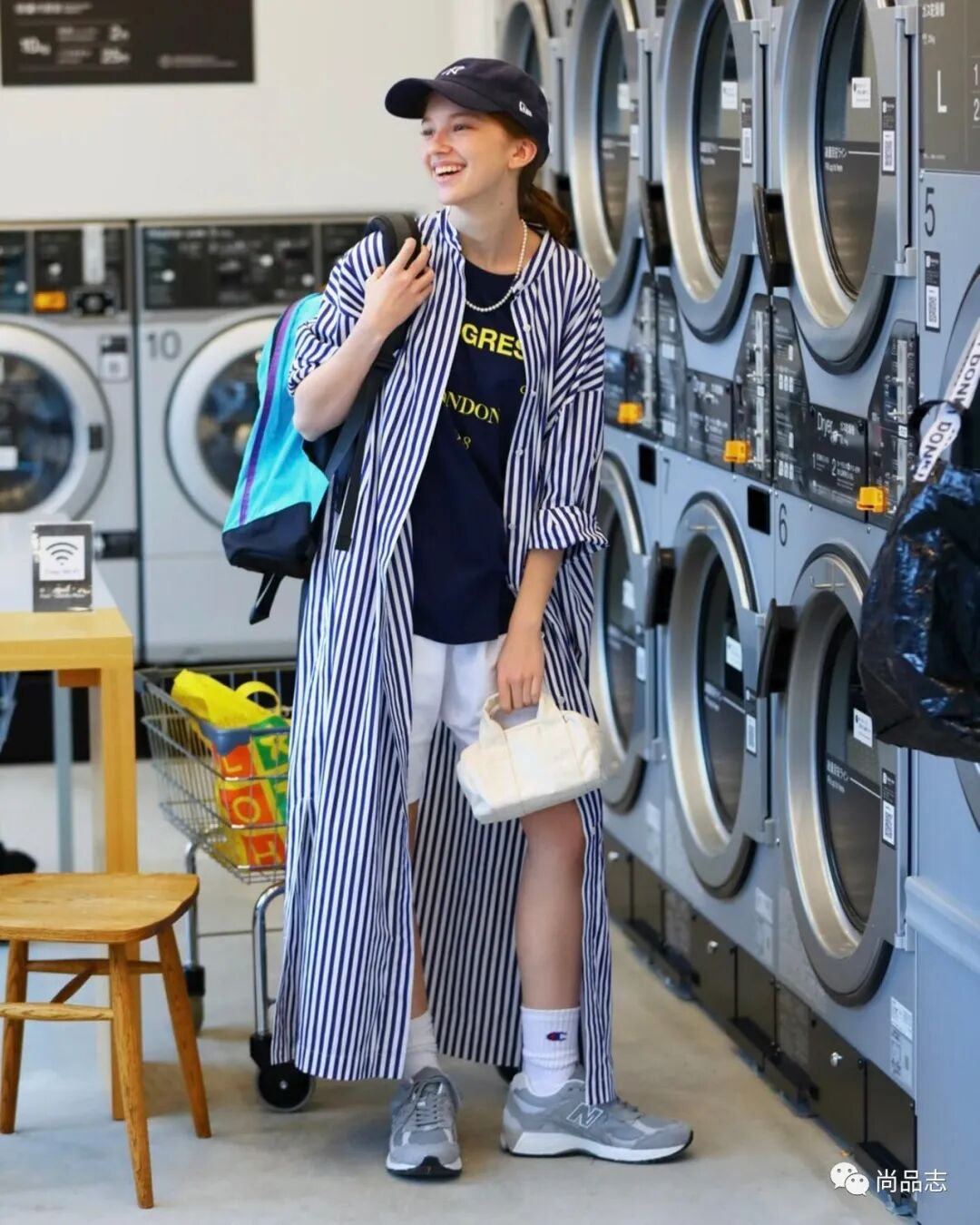 在衬衫裙外面加一条腰带,就换了另一个风格。