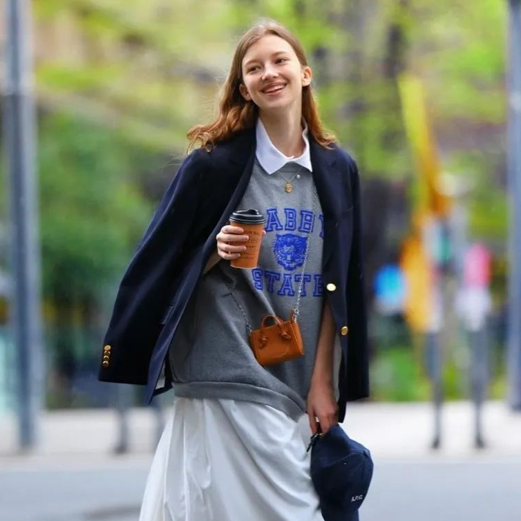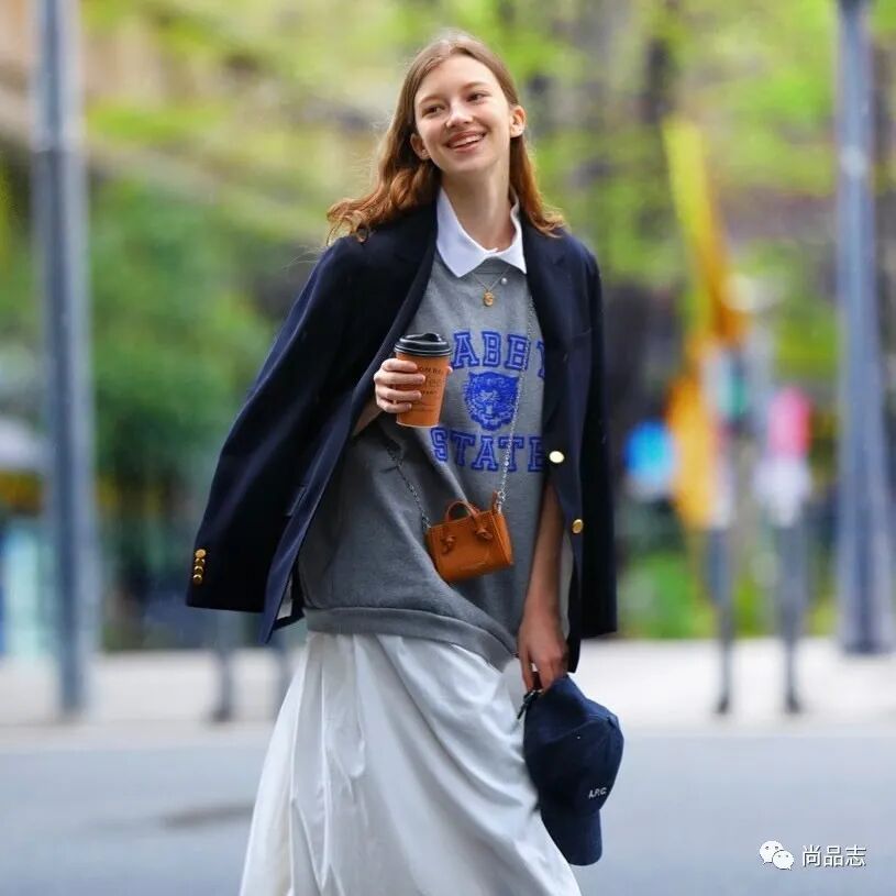 西装卫衣配上裙子,风格就没那么休闲硬朗了,也是同样的道理。