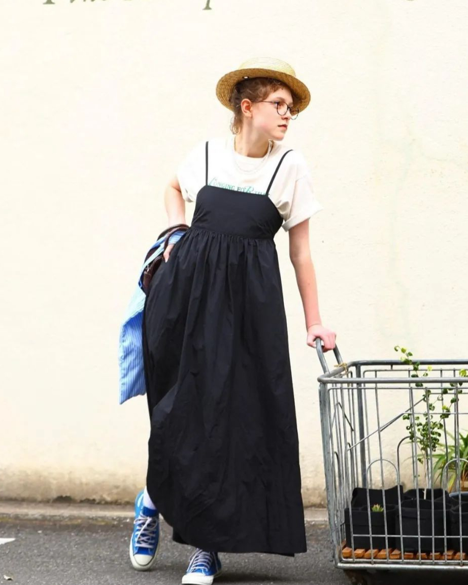 第二个穿法是上面说过的吊带裙+T恤的延伸穿法,下面再配一条裤子。