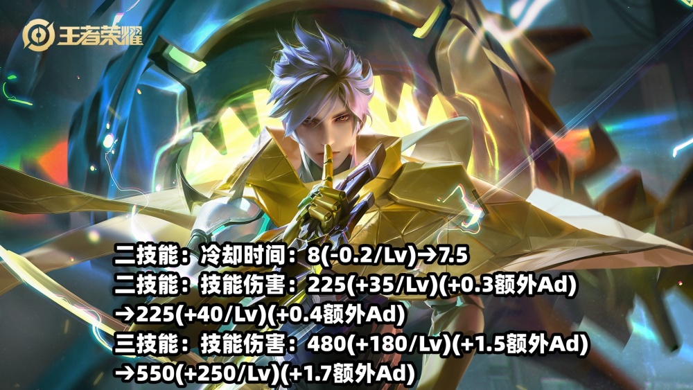作为平衡,二技能每一级基础伤害增加5点,满级增加25点,额外AD增加0.2,技能伤害提升。三技能基础伤害增加70点,技能成长伤害增加140点,额外AD增加0.2,大招伤害大幅增加,收割和突进伤害更高。