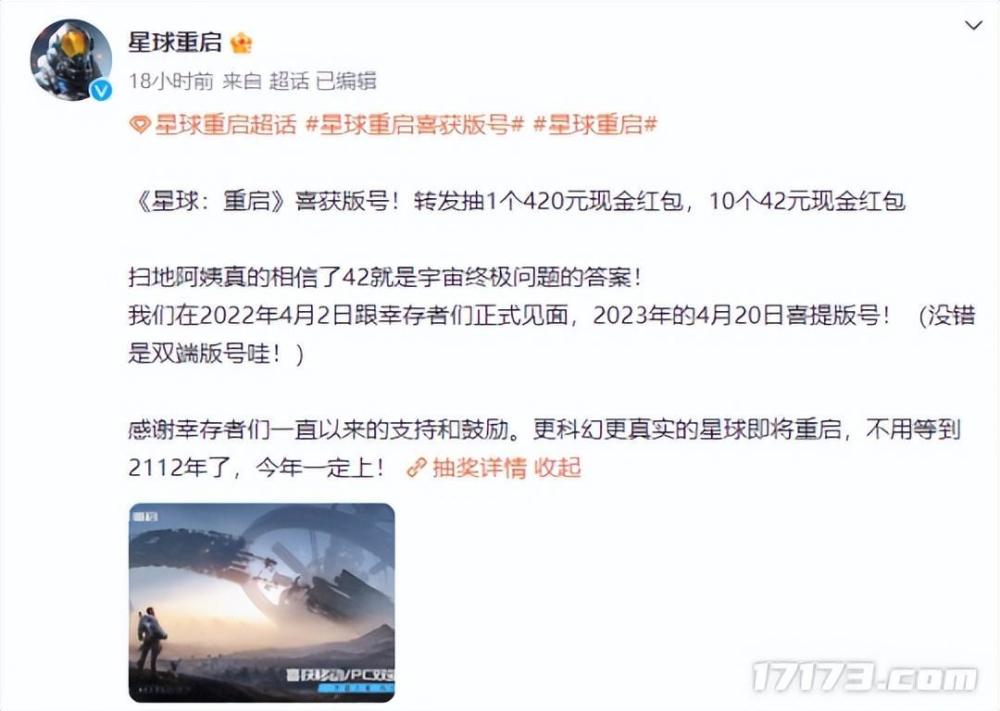 而在成功拿到版号后,游戏的官方微博专门进行了转发抽奖活动以示庆祝,同时也表示游戏一定会在今年上线。《星球:重启》国服上线之后,毫无疑问会成为腾讯《黎明觉醒:生机》以及网易《明日之后》的巨大劲敌。