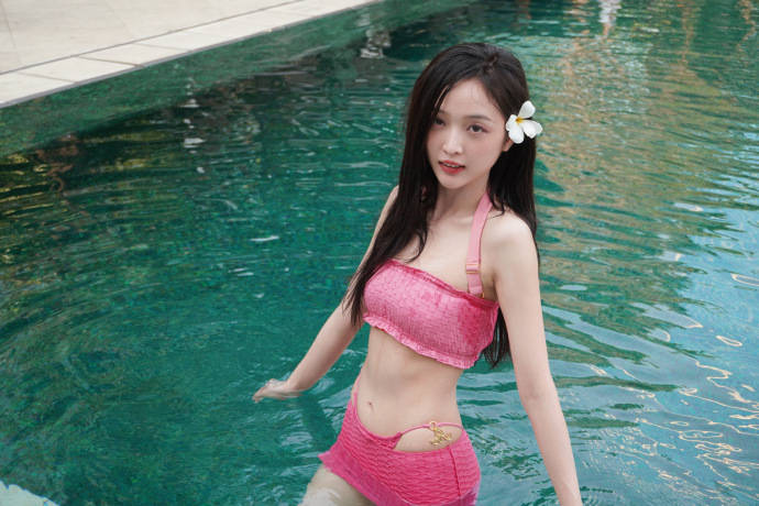 身穿粉色泳衣的她,身材纤细,肌肤水润白嫩,晶莹剔透,吹弹可破。