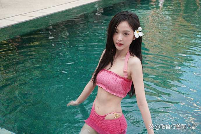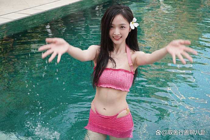 照片中的她,身穿热辣泳衣在泳池边摆拍,气氛超夏天,穿着粉色泳衣在游泳池里玩得非常嗨。