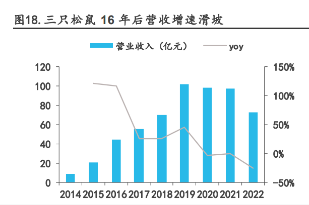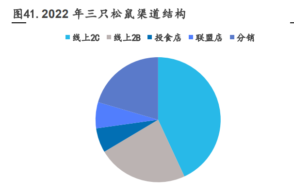 三只松鼠 2012 年成立之初即进驻线上天猫淘宝渠道,当年双十一即成为电商食品销售第一, 借电商红利东风快速发展壮大,至 2019 年突破百亿规模。期间 2020 年开始拓展线下分销, 通过经销商覆盖全国各大商超,以年货节坚果礼为突破口带动渠道增量。2016 年三只松鼠 开始探索线下门店模式,2018 年开放加盟模式拓展联盟小店,2019 年加速开店,但线下客 流缩减及 SKU 精简,影响单店模型,2021 年后陆续闭店调整。2023 年,在零食性价比需求 凸显、零食店加速开店浪潮之下,三只松鼠即将以高端性价比为核心,结合自身扩品类优势 及供应链优势进入社区零食店赛道,打开增长新空间。并将拓展加盟模式,实现门店数量快 速扩张。 2022 年在线上电商红利衰减、线下公司主动闭店调整之下,全年实现营收 72.93 亿元,同 比-25.35%,其中线上实现 47.88 亿元,占比 65.66%,未来将聚焦“品销合一”,转向品类 精细化运营,精简线上促销费用投放,通过硬折扣提升性价比。线下门店实现 9.44 亿元, 占比 12.94%,2022 年末公司仅保留 23 家直营店、538 家加盟店,期间分别净减少 117、387 家。分销业务实现 14.74 亿元,贡献 20.21%营收,主要集中于年节礼盒销售,未来将着力 提升日销产品占比。此外公司将转型拓展社区零食店,也将贡献渠道增量。