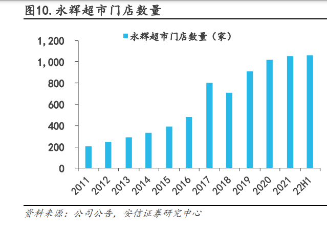 以永辉为例,复盘永辉发展历程,三阶段发展重心有所不同。永辉超市 2012 年前快速开店 布局,结合低基数优势,2007-2012 年保持 40%以上营收增速。2012-2019 年电商快速渗透阶 段,永辉凭借资金优势,结合全国生鲜配送、供应链优势等持续扩店,此阶段营收增速回落 至 15%-25%区间。疫情后线下客流明显减少,叠加社区团购、零食店等新业态兴起,永辉扩 店节奏明显放缓,营收增速进一步回落。 疫情影响叠加消费需求分化,线下商超探索转型新业态新模式。一方面疫情推动到家业务快 速发展,满足居家消费场景,截至 2022 年 6 月末“永辉生活”自营到家业务覆盖 992 家门店 (总共 1060 家),第三方平台到家业务覆盖 918 家门店,新零售销量占比 15.40%。另一方面 探索仓储店、精品商超业态,截至 2021 年末开设 75 家 Bravo 精品商超、53 家仓储会员店, 向高端化方向迈进。