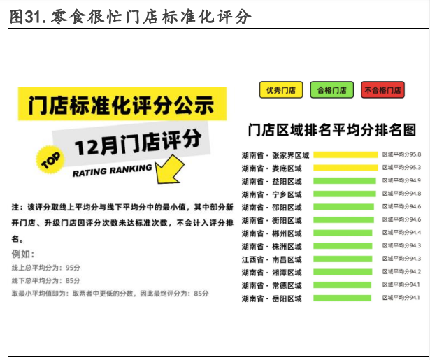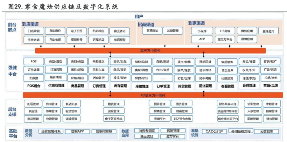 供应链降本增效,产品性价比高。零食量贩店生意模式的本质在于薄利多销和精细化运营, 门店产品价格基本定位 KA 等线下渠道 70%左右,其中价格竞争优势来自于:1)去掉 KA、经 销商等中间环节,直接对接上游零食供应品牌,精简进场费、陈列费等中间费用,以及经销 商环节的利润空间。2)聚焦核心大单品,通过高周转保障盈利能力。零食店以知名品牌核心 产品引流,结合白牌产品盈利,前端门店保持 18%左右毛利率,后端供应链维持 8%-10%左右 稳定利润率水平。3)供应链和数字化优势使品牌具有较高的门店复制能力,易于形成规模化 优势。例如零食很忙于 2019 年推行门店标准化机制,让门店开拓更易于复制;目前拥有长 沙、衡阳、南昌、荆门超 8 万㎡现代化物流仓,并且具有专业的供应链团队、高强度的物流 配送网和高周转效率的现代化供应系统,保障零食很忙全国门店货物 24 小时必达。再比如 零食魔珐通过自主的信息系统,打通了前端的用户分析、商品分析,门店的选址、传感热力 图、进销存、ERP、CRM,中台的物流、仓储,以及后台实时的数据分析等,满足精细化运营 的需求。