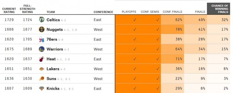值得一提的是,如此一来,NBA季后赛史上最强奇景也诞生了,东西部1-8号种子皆有球队晋级次轮,分别是1号种子掘金、2号种子绿军、3号种子76人、4号种子太阳、5号种子尼克斯、6号种子勇士、7号种子湖人、8号种子热火。