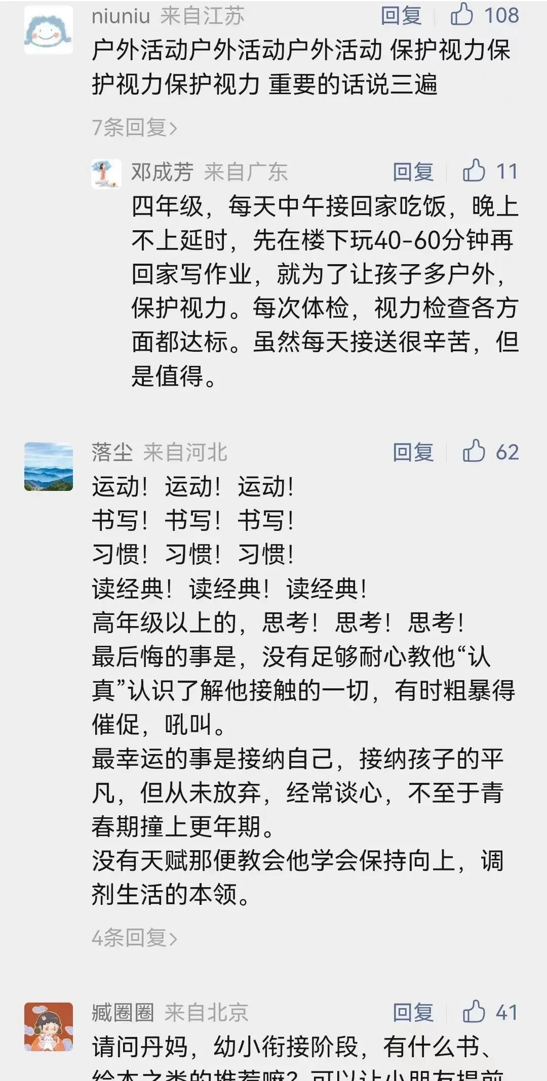 多个妈妈提到要给孩子留出一小块空白时间,允许他做自己的事,看书、发呆、疯玩都行。