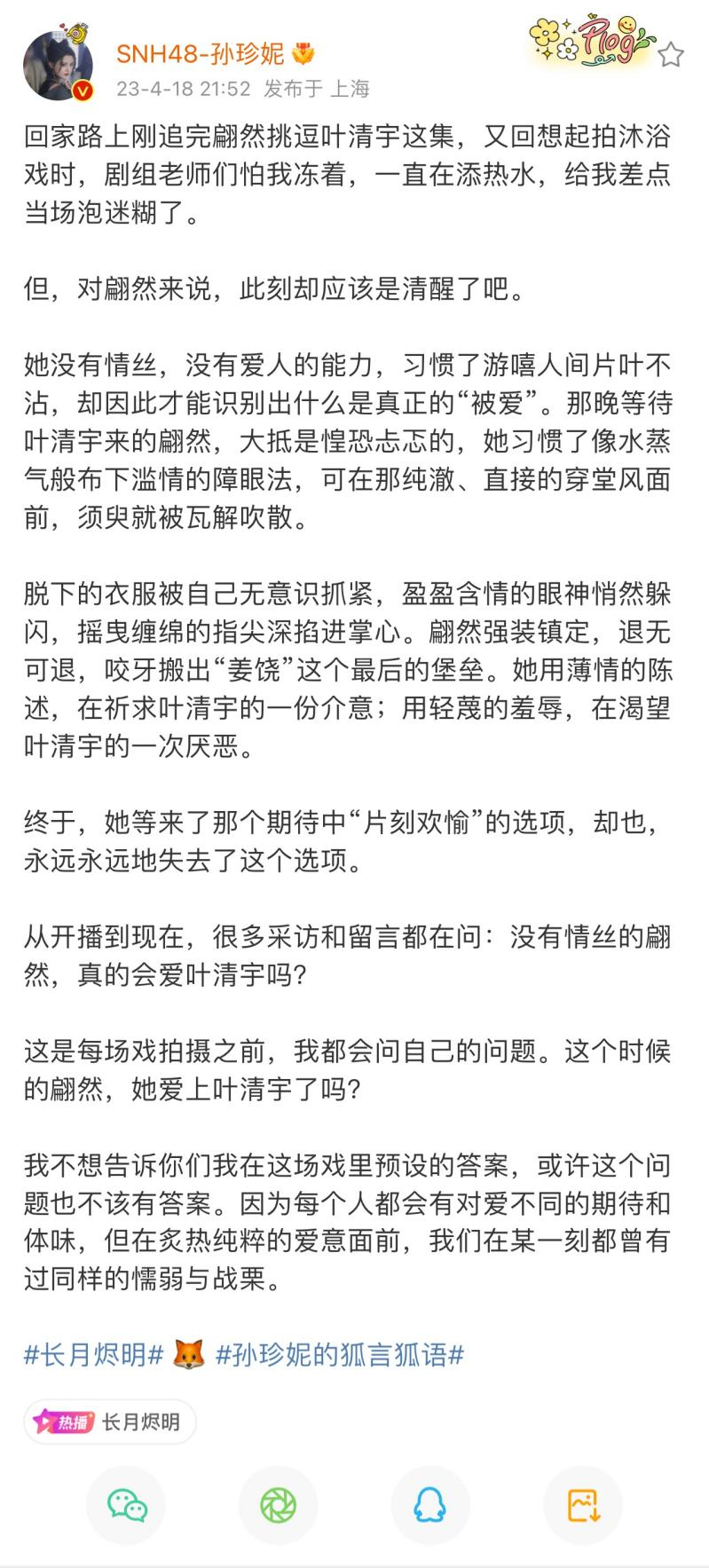 游戏人间的妖艳小狐狸、全年无休的996打工狐、为CP出谋划策的狗头军师、面对爱人矛盾又清醒的爱的勇士……一个多面的角色,在孙珍妮的诠释和解读下变得生动可爱,也让演员孙珍妮得到了许多观众和剧粉的认同。