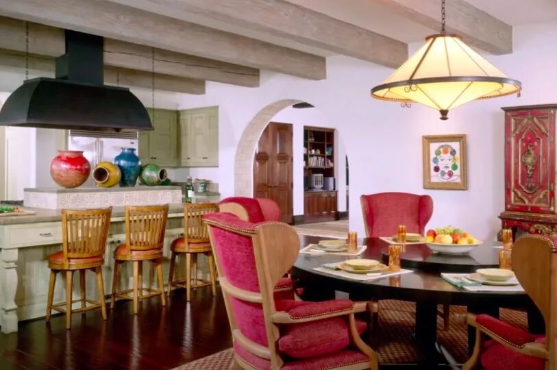 天花板上的原始房梁没有被拆除,搭配红色绒面餐椅、红色复古置物柜,让人仿佛置身于老电影中。
