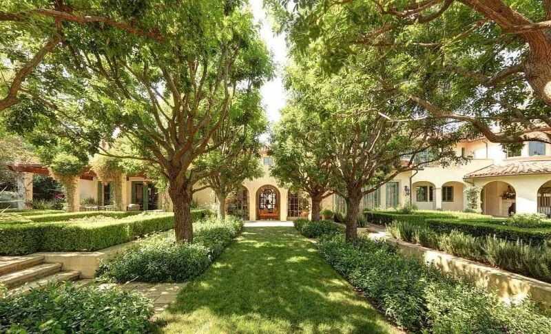 院子以对称式布局的形式,种植着高树、矮灌木和各种花花草草。