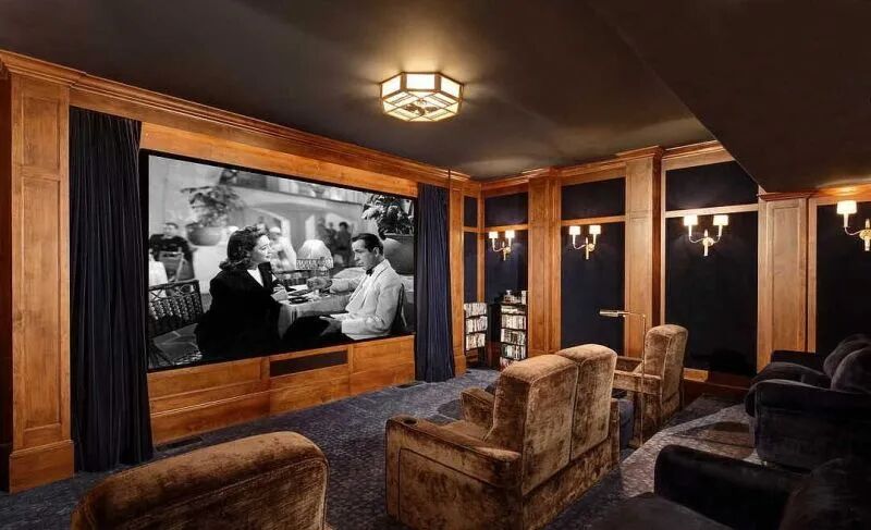 实木墙面、丝绒窗帘、深棕色绒面座椅组成了复古舒适的家庭影院。