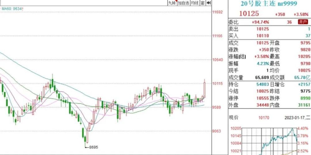 1月17日,截至16:15,20号胶主连上涨3.58%,交易量65.78亿,最新价格10125。