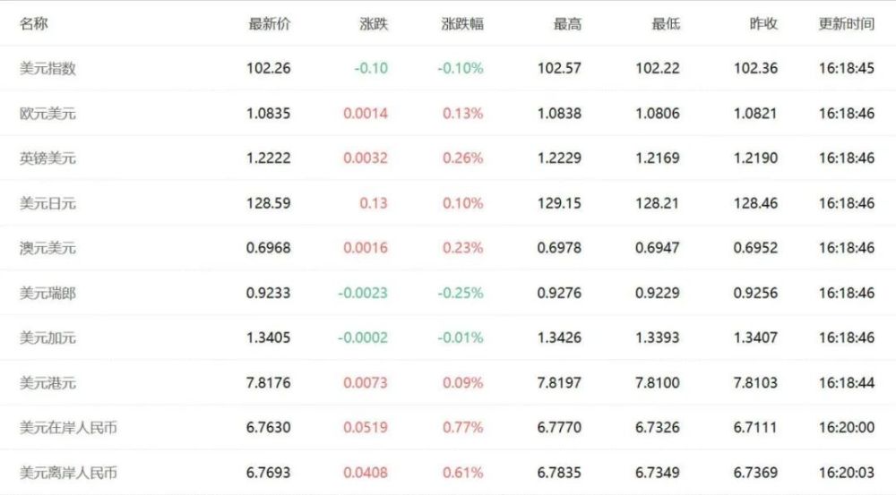 截至1月17日16:18,美元指数下跌0.10%,报102.26;欧元上涨0.13%,报1.0835;英镑上涨0.26%,报1.2222。