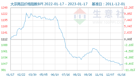 1月17日大宗商品价格指数BPI为1006点,较昨日下降了1点,较周期内最高点1343点(2021-10-19)下降了25.09%,较2016年02月03日最低点660点上涨了52.42%。(注:周期指2011-12-01至今)