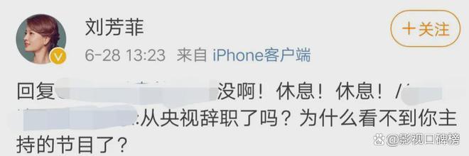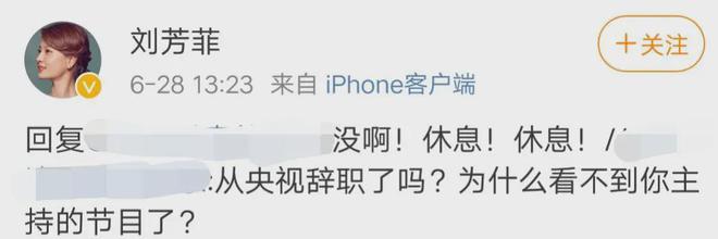 2020年6月份有网友在刘芳菲的社交平台上询问:从央视辞职了吗?她回应说:没啊!休息!休息!