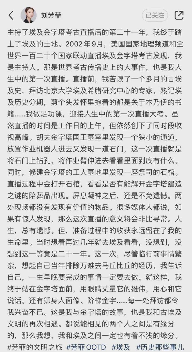 知名主持人刘芳菲近日在个人社交平台上更新了一则动态,配文:金字塔,终于见到你。主持了埃及金字塔考古直播后的第二十一年,我终于踏上了埃及的土地。