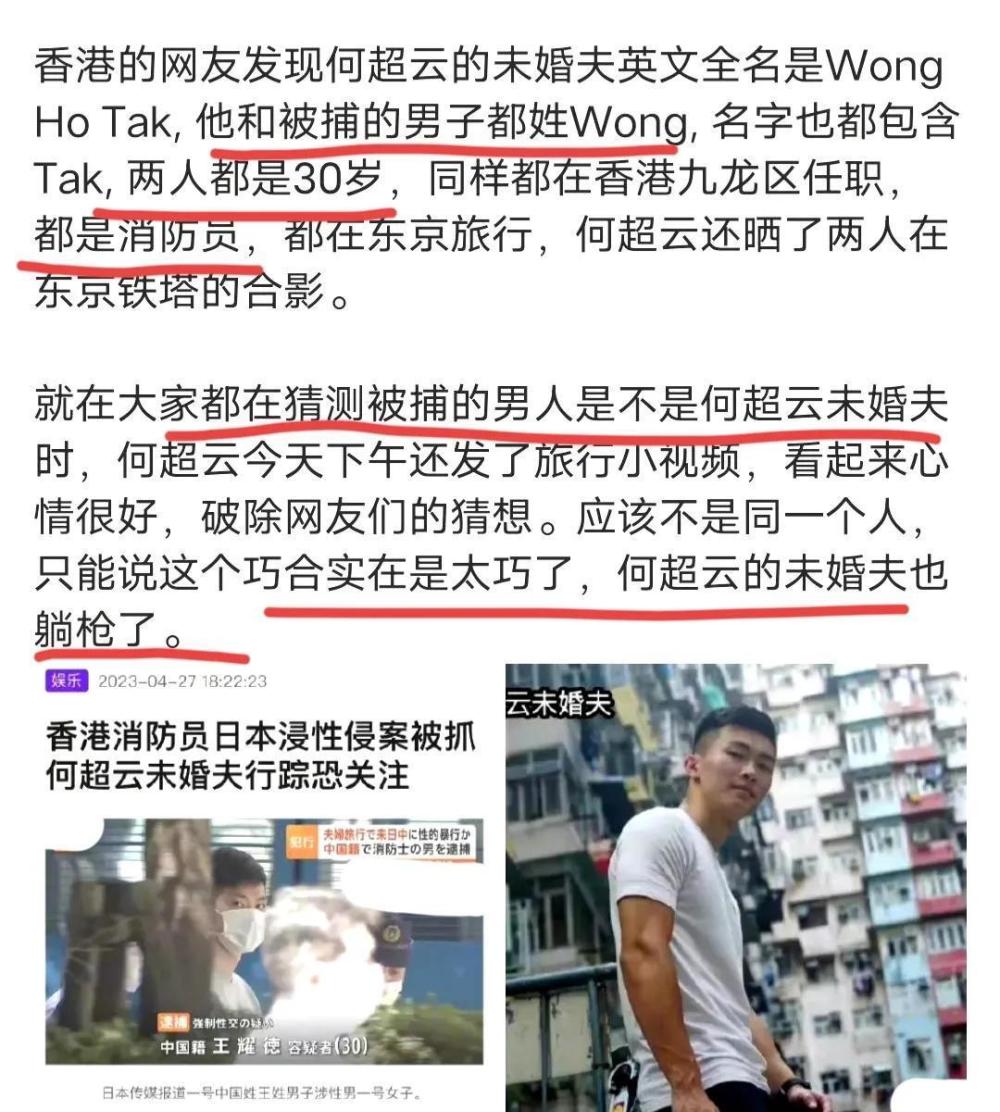 不过,何超云之所以会登上娱乐热搜榜,并不是因为她和男友也准备结婚,而是因为她的消防员男朋友,疑似涉嫌在日本性侵。