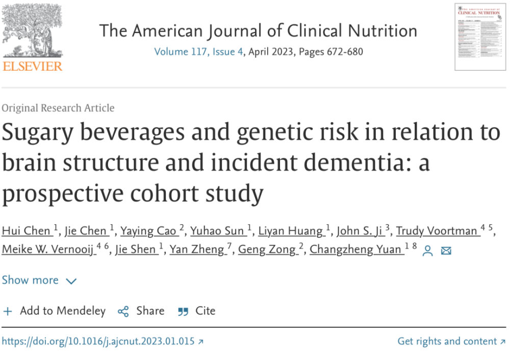 [1]Chen H, Chen J, Cao Y, Sun Y, Huang L, Ji JS, Voortman T, Vernooij MW, Shen J, Zheng Y, Zong G, Yuan C. Sugary beverages and genetic risk in relation to brain structure and incident dementia: a prospective cohort study. Am J Clin Nutr. 2023 Apr;117(4):672-680. doi: 10.1016/j.ajcnut.2023.01.015. Epub 2023 Jan 27. PMID: 36781080.