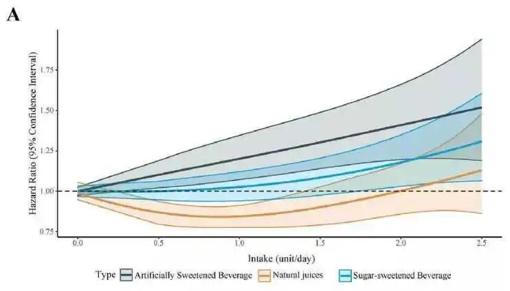 结果显示,与从不饮用的相比,每日饮用>2杯的SSBs与罹患痴呆症的风险增加34%有关;与之类似,每日饮用>2杯的ASBs与罹患痴呆症的风险增加20%有关。