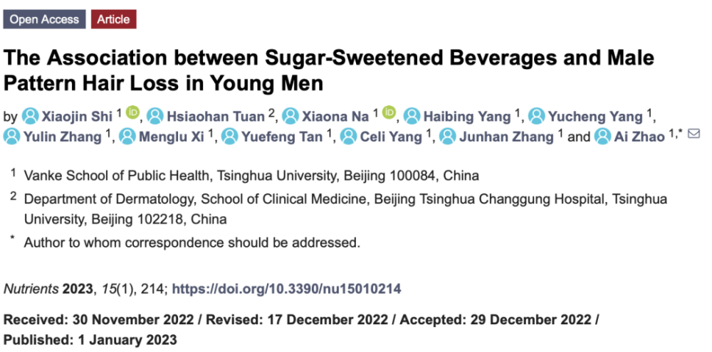 [2]Shi X, Tuan H, Na X, Yang H, Yang Y, Zhang Y, Xi M, Tan Y, Yang C, Zhang J, Zhao A. The Association between Sugar-Sweetened Beverages and Male Pattern Hair Loss in Young Men. Nutrients. 2023 Jan 1;15(1):214. doi: 10.3390/nu15010214. PMID: 36615870; PMCID: PMC9824121.