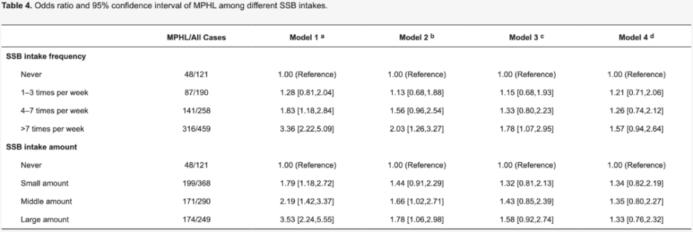 当然,结果并不令人意外,MPHL组饮用SSB的频率和总量明显更高—— MPHL组的SSB摄入量为平均4293mL/周,远高于正常对照组(2513mL/周)。同时,在MPHL组中饮用SSB>3500mL/周(相当于每天>1瓶)的参与者占29.4%,而该比例在对照组中仅为17.2%。