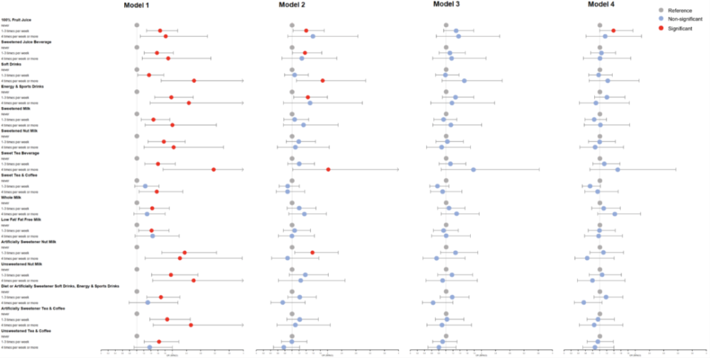 在最基础的模型中,几乎所有类型的SSB均能作为MPHL的风险因素;而在调整了混杂因素后,大多数SSB依然会增加罹患MPHL的风险,尤其要注意含糖果汁、软饮料(可乐、雪碧、芬达等)、能量/运动饮料、加糖的茶饮料等。