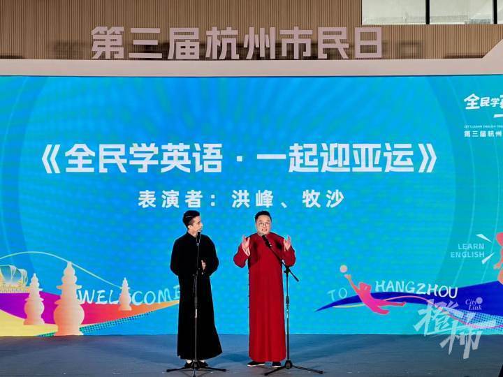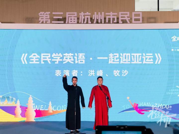 杭州之声主持人洪峰携手外籍嘉宾主持人牧沙,为市民带来了相声《学外语》,用诙谐幽默的语言讲一个“学英语·迎亚运”的趣事。