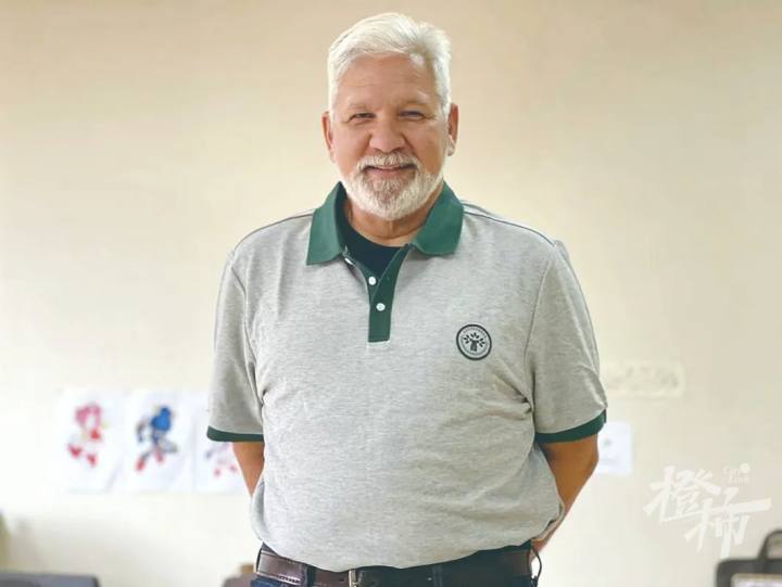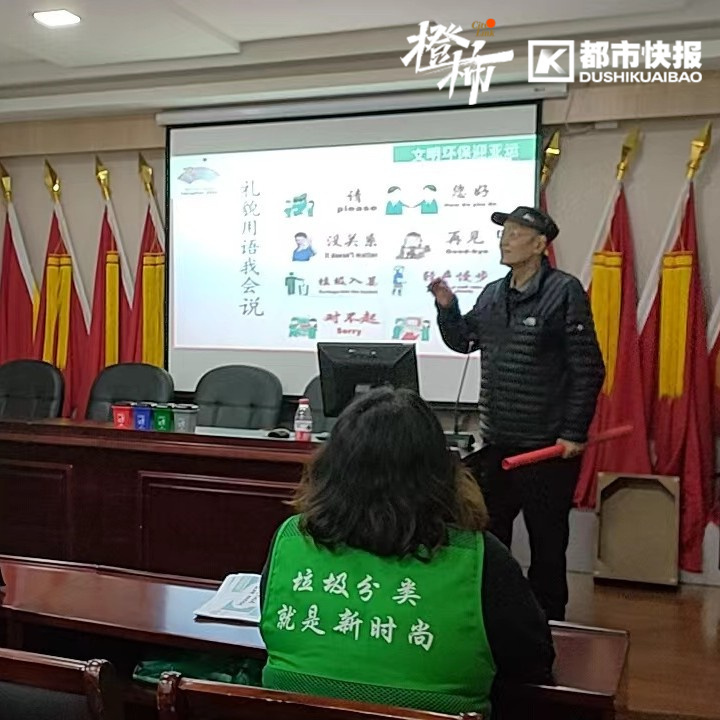 上城区九堡街道69岁的退休警察金立新,把英语课堂从菜市场“搬进”社区,教居民学习“亚运英语”。
