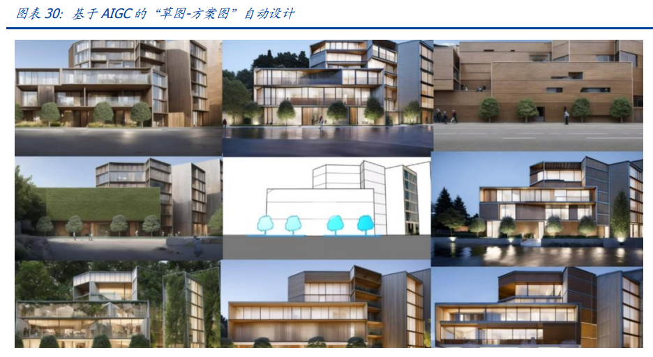 结合产业 Know-how 深度开发,后端设计环节智能化有望逐步打通。我们预计依托 AIGC 类技术,前端创意设计有望率先形成智能化突破:如华建集团已初步将 GPT、Stable Diffusion 等深度算法融入前端房建外观设计。后端初步设计对行业经验依赖度较高,预 计需要基于行业 Know-how 形成的更深入算法模型,存在开发周期,短期看较难实现; 施工图设计相对流程化,但细分领域较多,不同施工区域的智能化需要逐个攻破。长期 看,随着算法模型逐步成熟,AI 有望介入方案构思、初步设计、施工图绘制、三维模型 输出、图纸审查等多个环节,同时依托多模态大模型应用,实现“需求输入”-“AI 设计” -“需求反馈”-“设计更新”的完整闭环,大幅提升设计效率,优化业务模式。