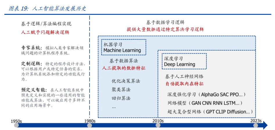 超大复合型网络算法逐步成熟,AI 技术迎突破性拐点。早期 AI 算法主要基于逻辑/算法 编程实现,由人工赋予问题解决逻辑,常见应用包括专家系统、定制逻辑、预定义智能 等,后随着数据信息增多,逐步发展出决策树、逻辑回归、聚类等机器学习算法,此类 算法主要基于人工提取的数据特征进行分类、回归、降维等相对线性的工作。2010 年起, 基于人工神经网络的深度学习算法快速发展,如 AlphaGo、GAN、CNN/RNN、LSTM 等。 神经网络算法下训练的 AI 可自动提取数据内在特征,通过持续反馈迭代实现如图像语音 识别、自动驾驶、策略游戏(如围棋)等更智能化功能。2017 年,Google 机器翻译团队 在《Attention Is All You Need》中提出 Transformer 算法,该算法基于自注意力机制, 有效解决传统 RNN 无法并行计算及 CNN 无法有效学习全局信息的问题,可高效实现并 行化,以训练超大 AI 模型。Transformer 的应用标志着基础模型时代的开始,GPT 等超 大复合型神经网络算法逐步成熟,AI 逐步由“感知智能”走向“认知智能”,相关技术及 下游应用迎来重要发展拐点。