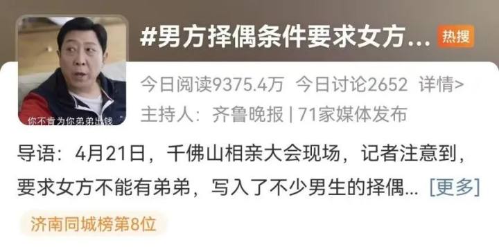 手机访问:wap.265xx.com男生相亲要求“女方没有弟弟”?近三成网友表示理解!这一话题冲上热搜,专家:畸形,