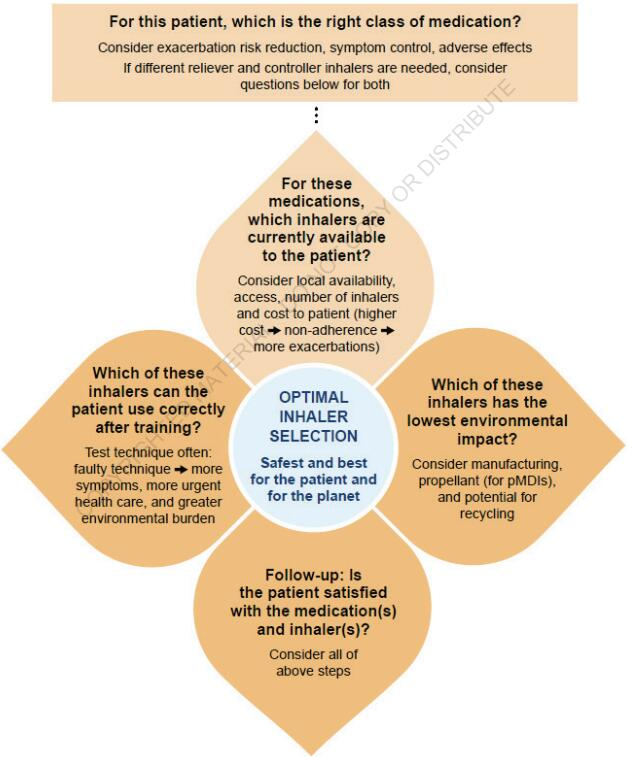 指南建议,首先应为患者选择最合适的药物来减少病情恶化并控制症状;其次,应在可用于该药物的吸入器中,选出患者在训练后可以正确使用的那一种;如果有多种可选,还应考虑其中哪一种对环境的影响最小,以及患者对其是否满意。