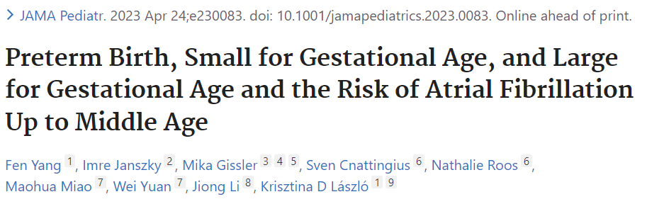 [1]Yang F, Janszky I, Gissler M, etal. Preterm Birth, Small for Gestational Age, and Large for Gestational Age and the Risk of Atrial Fibrillation Up to Middle Age[J]. JAMA Pediatr, 2023 Apr 24:e230083.