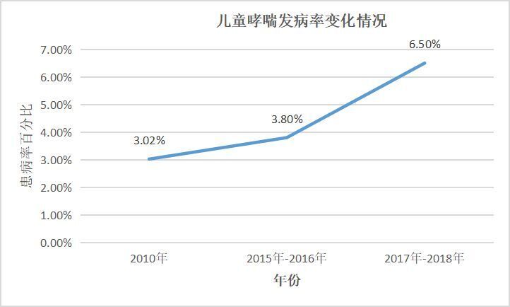 相关调查显示,2010年中国城市0至14岁儿童哮喘累积患病率为3.02%。2017至2018年中国儿童哮喘年患病率(6.5%)较2015至2016年(3.8%)显著上升。