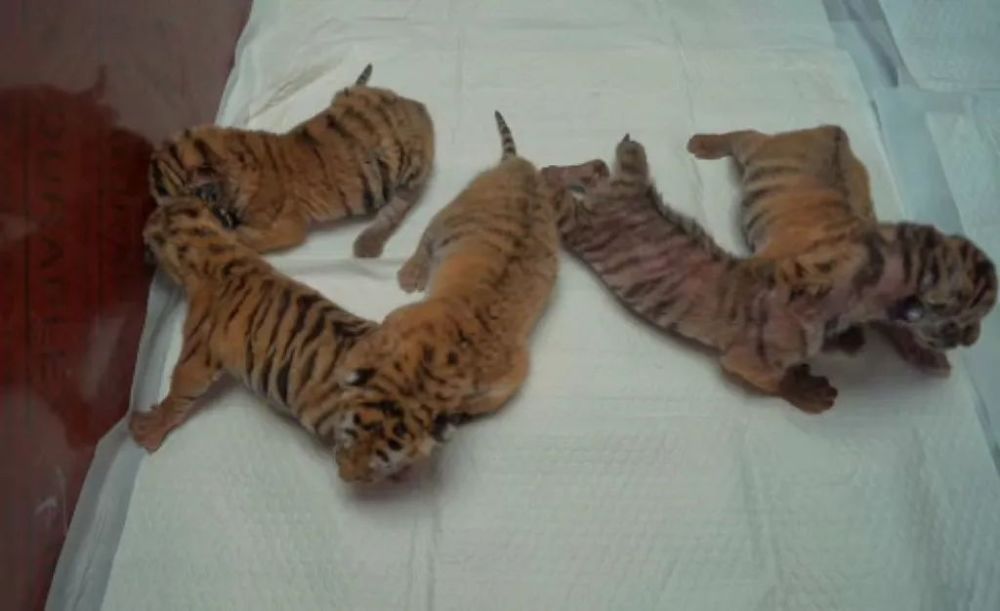 “目前我们已经降生了5只东北虎幼崽,一窝双胞胎,一窝三胞胎,2只母虎,3只公虎,非常可爱、健康。”黑龙江东北虎林园饲养员李鑫介绍,这两窝幼崽的母亲分别都是2018年出生的5岁母虎。东北虎通常4岁成年,5岁即可怀孕产仔。一窝能生2只到4只不等。由于是初产虎,奶水不充足,且没有照顾虎宝宝的经验,于是由人工进行饲养。