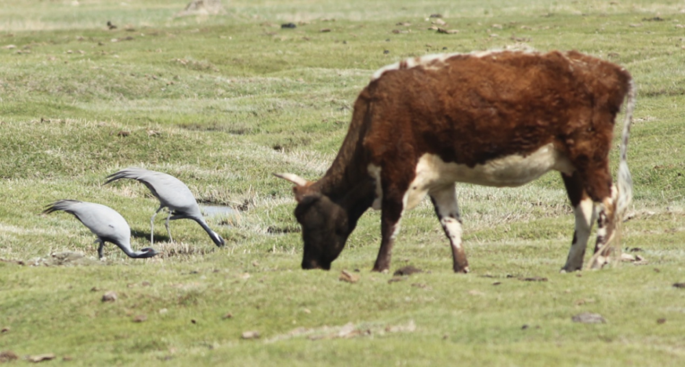 黄鹤远联翩,从鸾下紫烟(唐·李峤)。新疆每年春季或秋季有蓑羽鹤等迁徙鹤类数以万计。这些鹤类在迁徙过程中喜欢在农田中休息,并取食植物根茎、种子及收获庄稼后剩余的谷粒等,但也会破坏播种好的庄稼,造成颗粒无收。在调查过程中,我们多次遇到农户对田中的鹤类进行驱赶。
