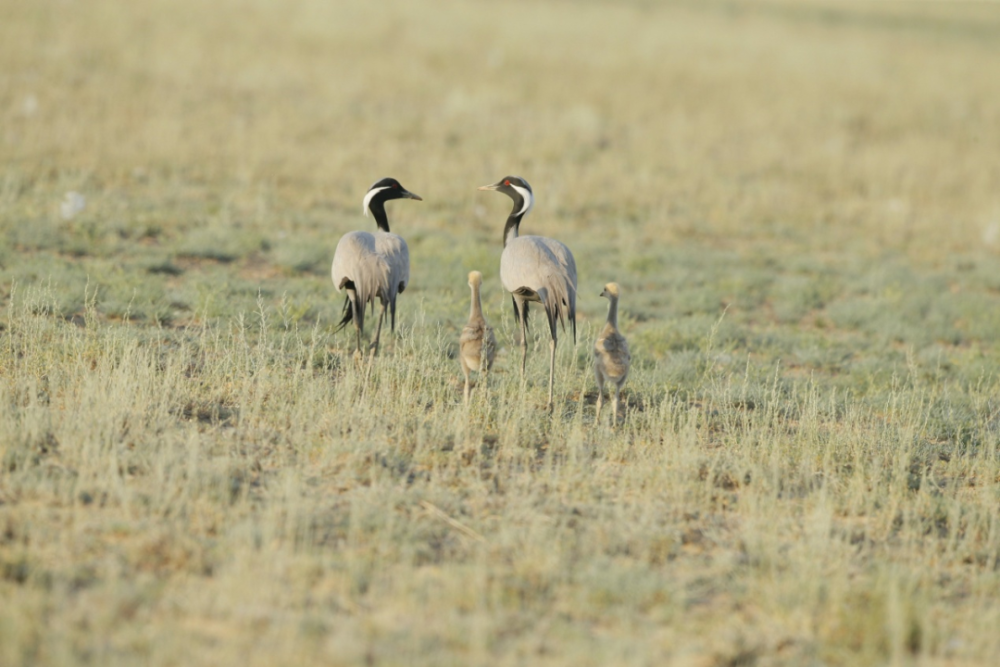 蓑羽鹤一家,幼鹤一出壳就会行走(早成性),紧随母亲身边。幼鹤的伪装色极佳,一旦遇到天敌,就地卧倒,很难被发现。(杨飞飞 摄)