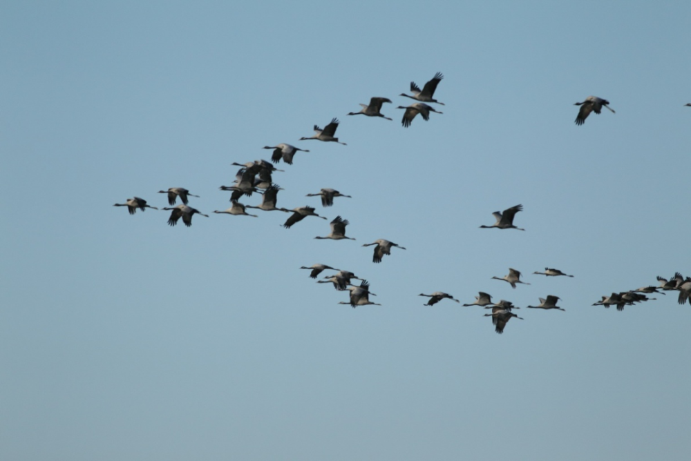 每年9月,蓑羽鹤早于天鹅等水禽开始南迁。原先单个鹤群家族不足10只,在短短的10天里就会迅速扩大到几百上千只。为了节省体力,鹤群在头鹤的带领下,靠上升的气流帮助自己飞得更高。飞在最前面的总是队伍中最强壮的,因为这个位置遇到的气流和飞行阻力都非常大。它们的队形排成“一”字或“人”字形迂回攀高,这样可以最大限度地减少空气阻力。