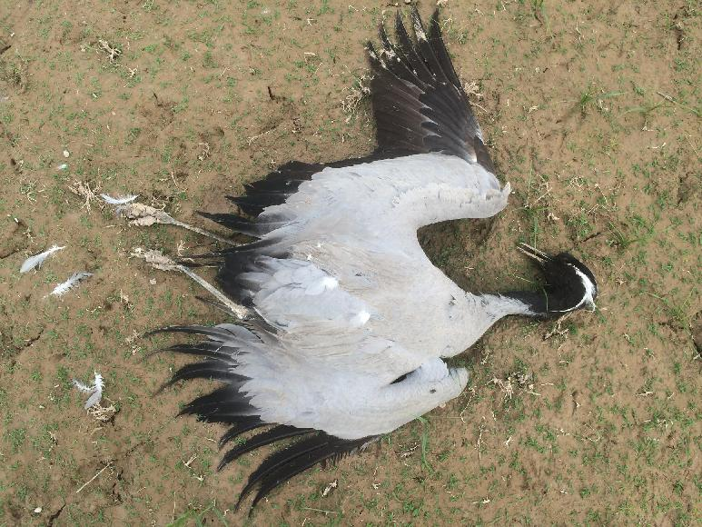 2016年5月,正是春季迁徙季,笔者带领科研团队在新疆阜康地区进行鸟类调查,发现田间有一只中毒死亡的成年蓑羽鹤(照片)。