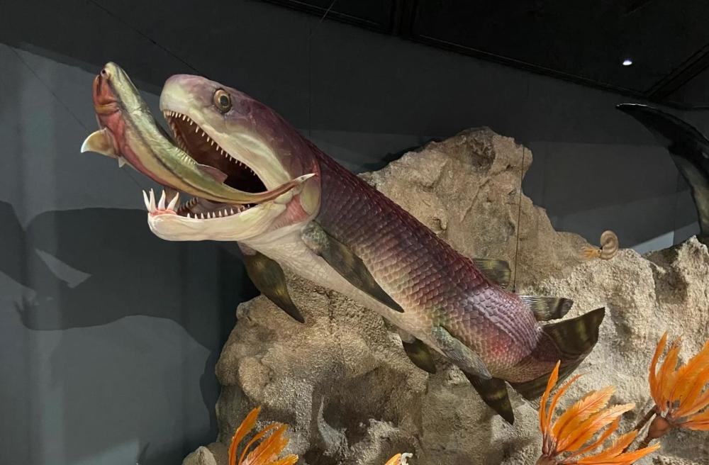 上图:博物馆展示的古鱼模型,其化石被发现含有保存最古老的脊椎动物心脏。