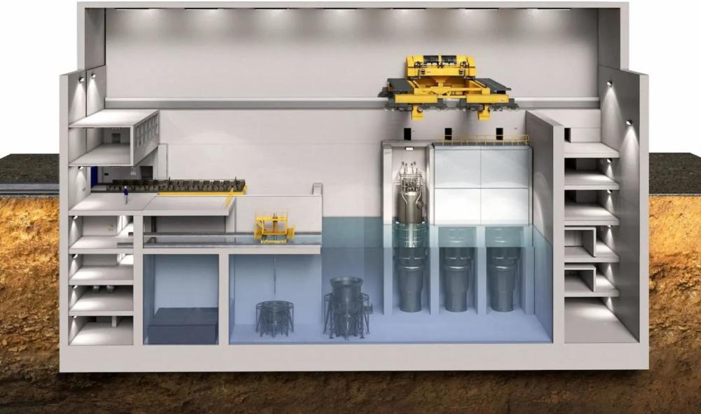 上图:NuScale SMR设计将4-12个小型模块化反应堆单元放在一个水浴池中,每个单元都以低成本批量生产。