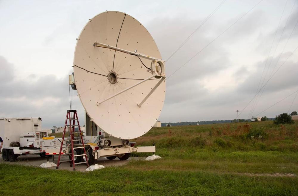 上图:在安全和连续功率波束形成-微波(SCOPE-M)演示中,微波碟形发射机指向整流天线。