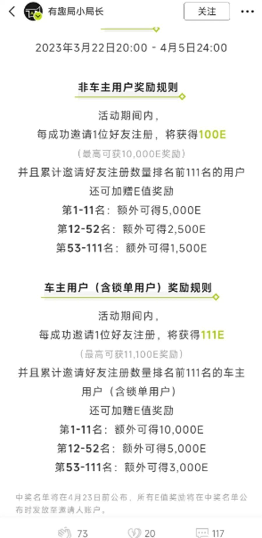 一位网友称,自己在活动期间成功邀请100人注册,且阿维塔APP活动页面也显示成功100人,但是直到超出规则约定的奖励发放日期,阿维塔APP仍旧没有发放活动奖励。当该网友就此事咨询后台客服时,客服却称,邀请好友E值活动的,官方经过确认符合活动规则的积分都已经发放了,如果没收到,建议提供邀请好友聊天截图,邀请100人的最好能证明邀请三分之一以上,且截图必须要带上日期。