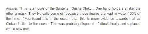 “如果你是在海里找到的这个,那就更加证明了Olokun与海洋有关。你手里这个可能是在某种仪式之后被处理掉了,然后换了个新的。”